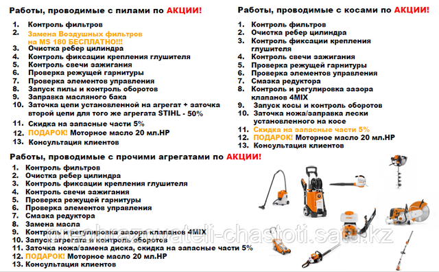 При проведении сервисной акции все владельцы агрегатов STIHL получают бесплатное обслуживание по следующим видам работ:
